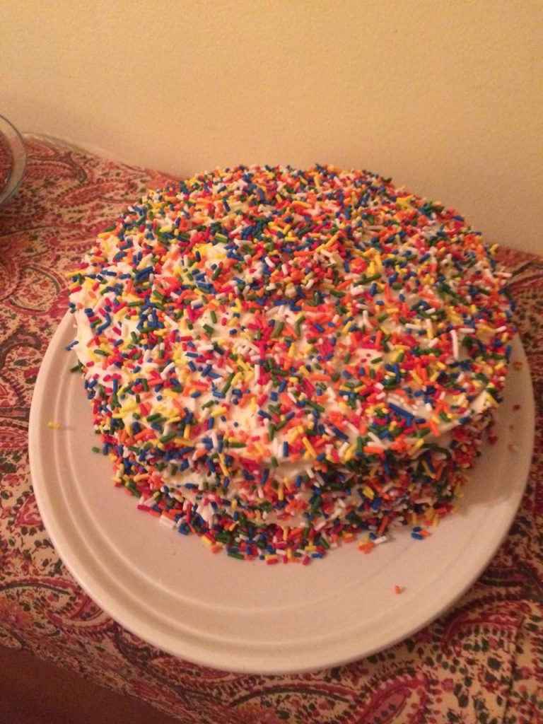 I made Confetti Cake inspired by Rainbow Sprinkle Cake recipe featured on NYTimesCooking with a store bought white cake mix for my son’s birthday. It was a big hit.