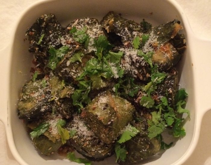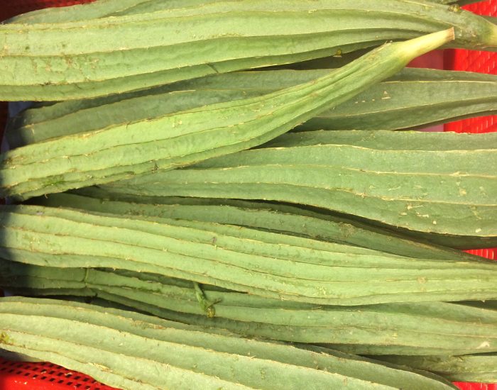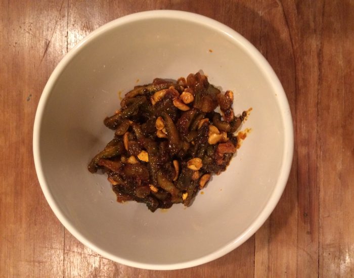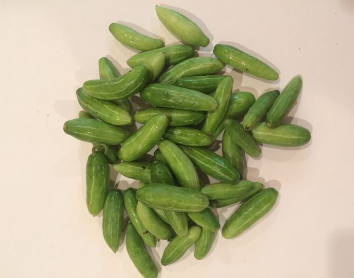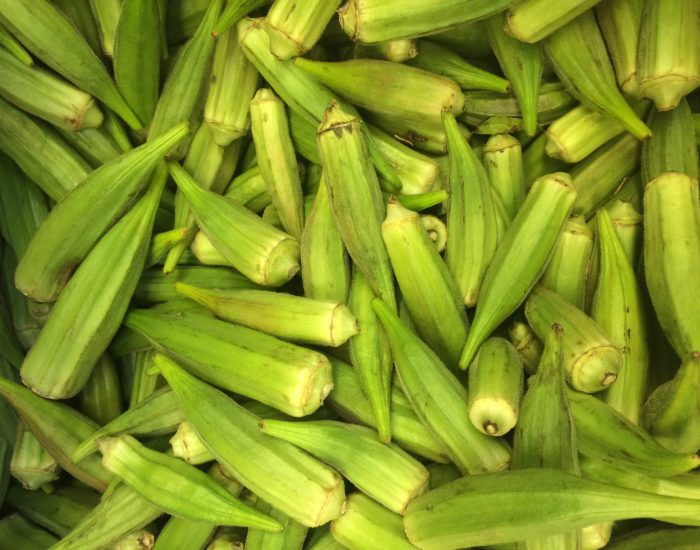Fries are easy to make. Cut smaller okra into fourths and large okra into half and then fourths. Season with salt and let sit for 10 minutes. Sprinkle mixture of chickpea flour and corn starch seasoned with salt, turmeric, chilli powder and garlic powder. Mix well to coat okra with flour mixture. Deep fry until golden brown and crispy.