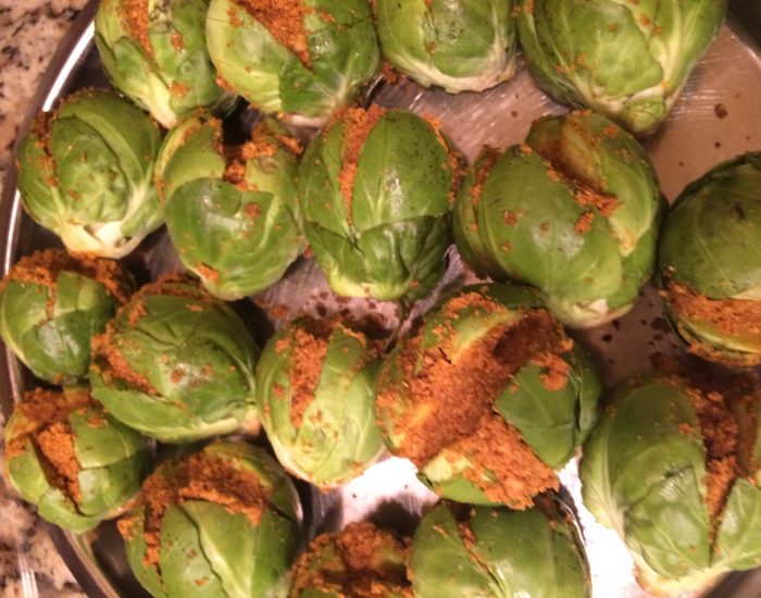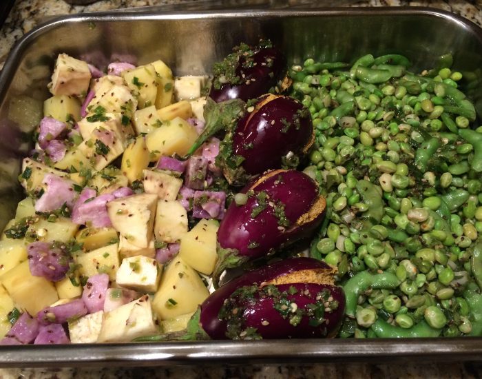 Green Bean Mac and Cheese Casserole, Hasselback Eggplant with Tomato/Harissa Sauce, Roasted Potatoes/Sweet Potatoes with Chile Crisp. Pumpkin Polenta, Brussels Sprouts/Apple/Orange Salad