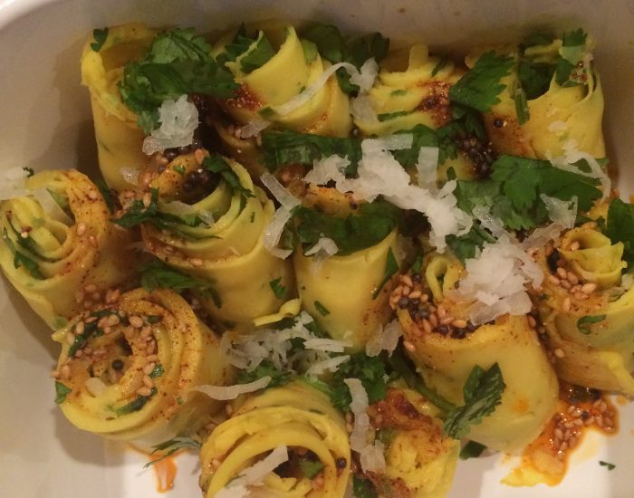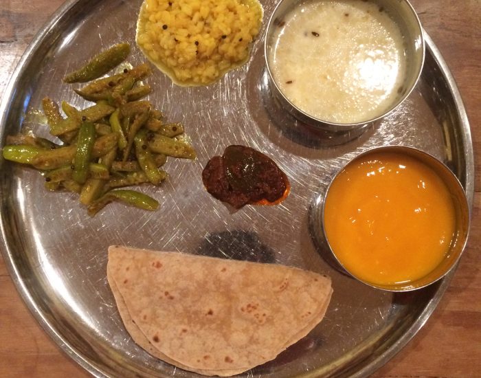 Orange TofuBowl of Bataka nu Rasavalu ShakA wokpan of FideuaBowl of ChannaBanana Cream PieCream Cheese Tart with Orange, Pistachio and CardmomA map of the Indian state of Gujarat