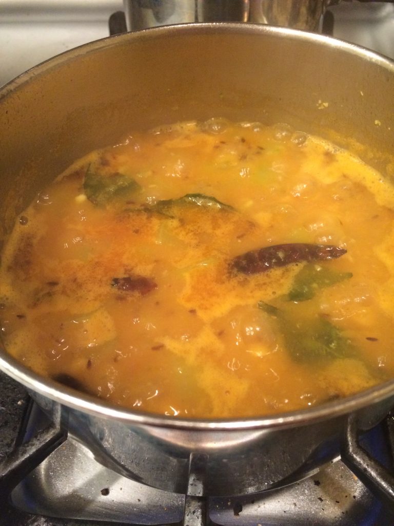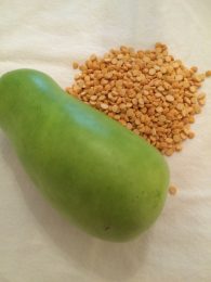 2. Peel doodhi and cut into ½ inch dice, discarding the seeds. Keep the cut pieces into water. Once doodhi is cut, drain and add it to pot with channa dal. If you are using zucchini do not add at this point. Cover with lid and let dal and doodhi cook for 40 to 45 minutes or until dal is soft on a medium heat or cook in a pressure cooker according to manufacturer’s direction. Add zucchini after dal is cooked and let it cook for 5 minutes with dal, uncovered.