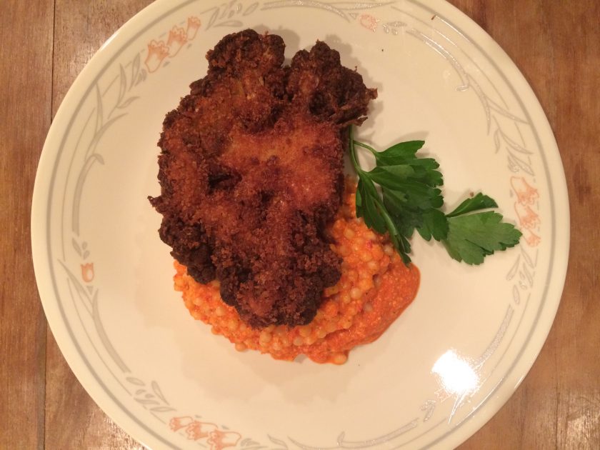 Print Country Fried Cauliflower Steak Prep time: 45 mins Cook time: 45 mins Total time: 1 hour 30 mins Serves: 4 This recipe is inspired by vegetarian episode of Guy’s Grocery Games show on Food network. Ingredients 1 large cauliflower 1 cup AP flour 1 cup buttermilk 2 eggs 1 cup panko bread crumbs 1 teaspoon […]