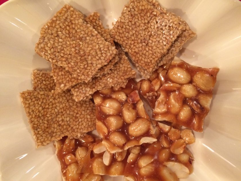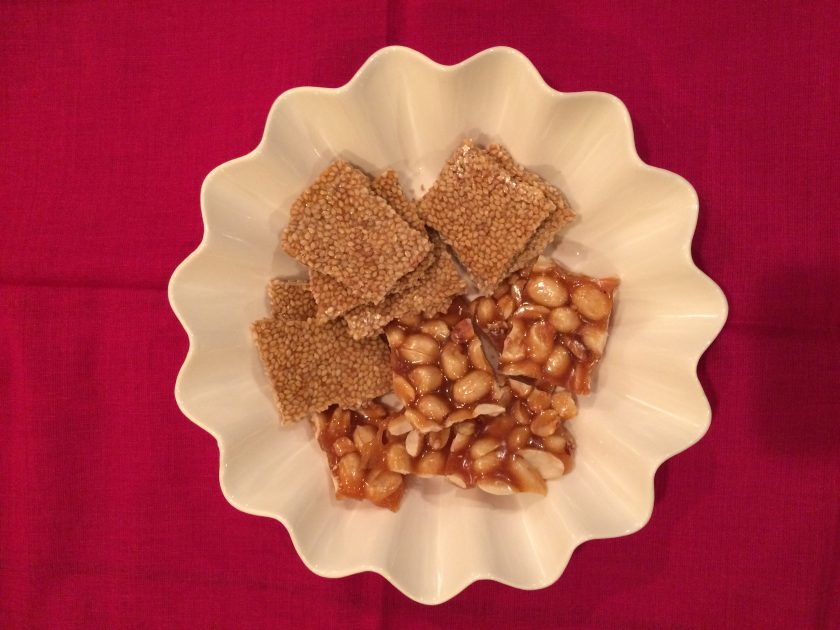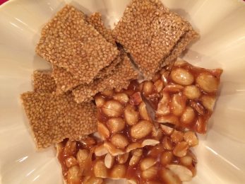 - Add sesame seeds or peanuts and stir quickly to combine with caramel. Transfer to silicon mat or brushed area. Roll out into ¼ inch thick approximatly 10 x 12 inch rectangle.