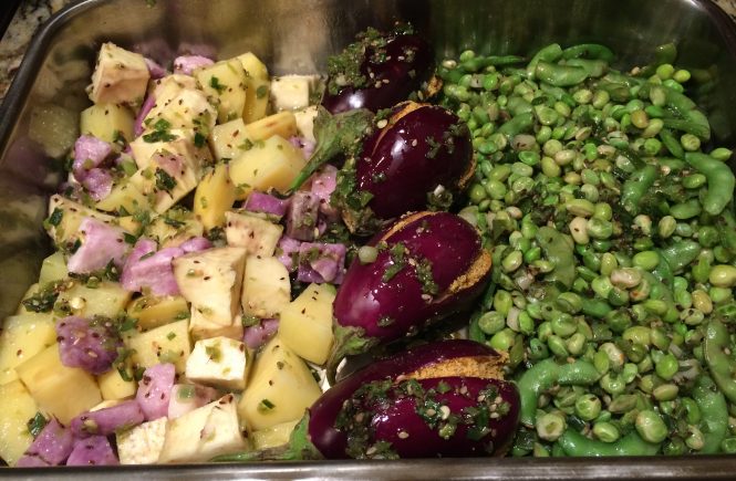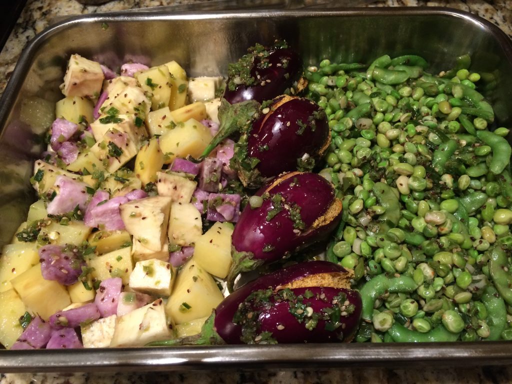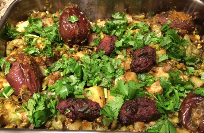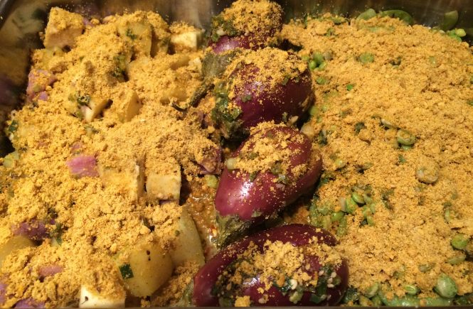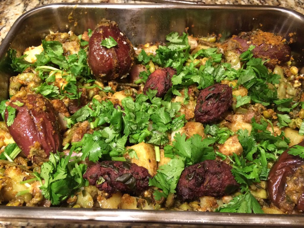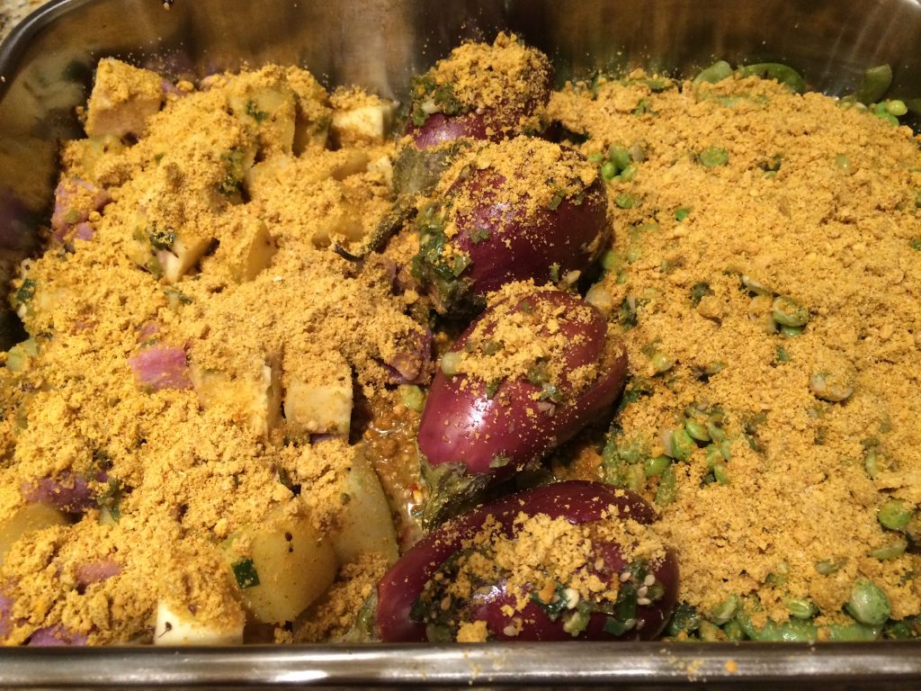 4. In a Dutch oven, first arrange stuffed eggplants and potatoes in single layer. On top arrange papadi, papadi lilva, tuver lilva. Spread ½ of spice mixture on top. Next arrange sweet potatoes and ratalu in single layer. Spread remaining spice mixture on top. Or in a roasting pan, arrange first eggplants vertically on one side, next arrange potatoes, and then arrange one by one papadi, papadi lilva, tuver lilva, sweet potatoes and ratalu. Spread spice mixture evenly on vegetables except eggplants and potatoes. Add ½ cup water in Dutch oven or roasting pan. Cover with lid or aluminum foil. You can either cook vegetables on stove top on medium heat or a preheated 375 degrees oven until vegetables are tender, about 30 to 35 minutes. Check on vegetables half way through cooking and stir gently with spice mixture. If vegetables are sticking to bottom, add more water.